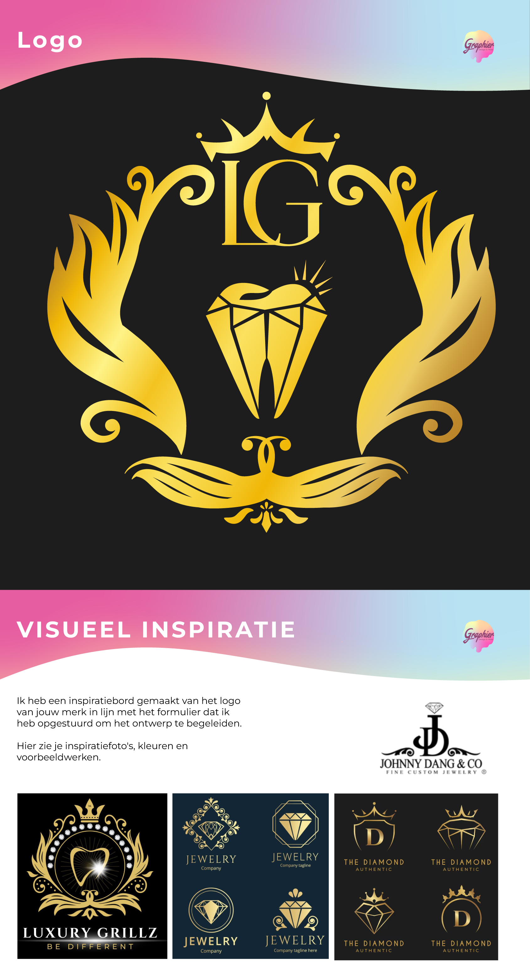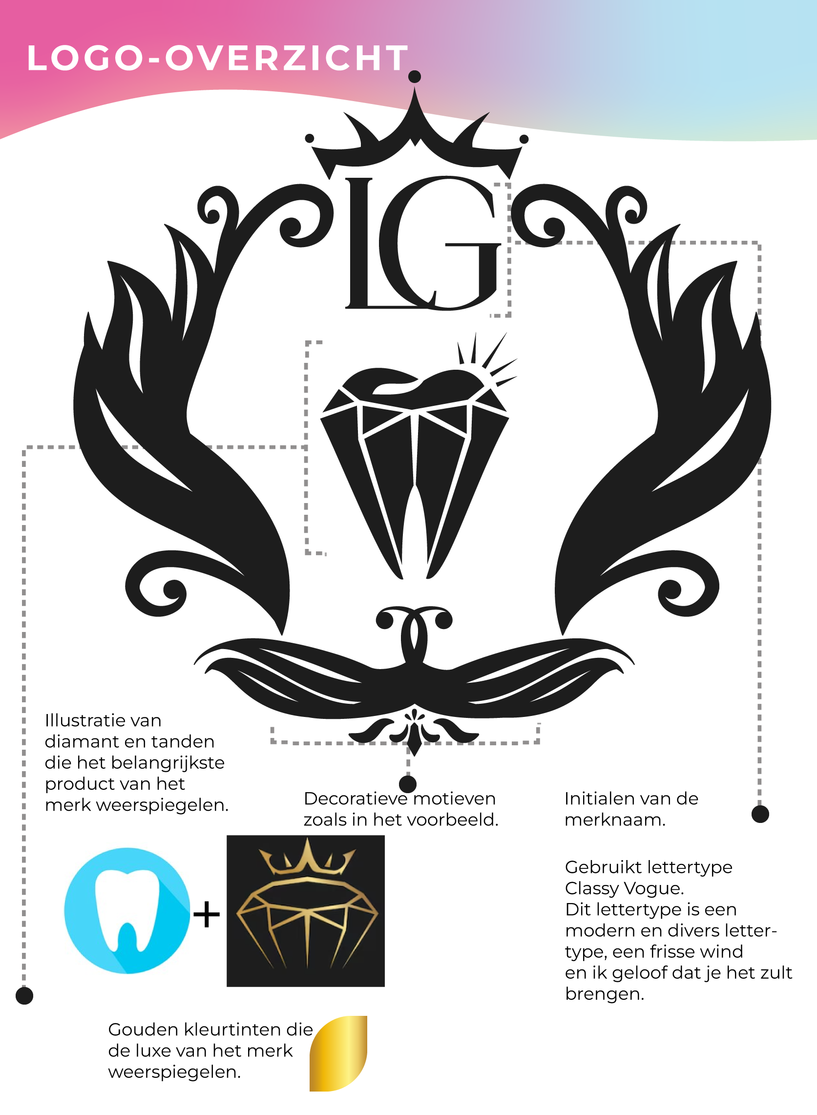 Een logo dat ik heb ontworpen voor een klant die tandpiercings en accessoires maakt. In de logo-gids die ik voor elke klant heb opgesteld, heb ik mijn logo-ontwerpen, de elementen die mij hebben geïnspireerd en uitleg geschreven. En tot slot kunnen ze de presentatie van het logo op hun producten zien.